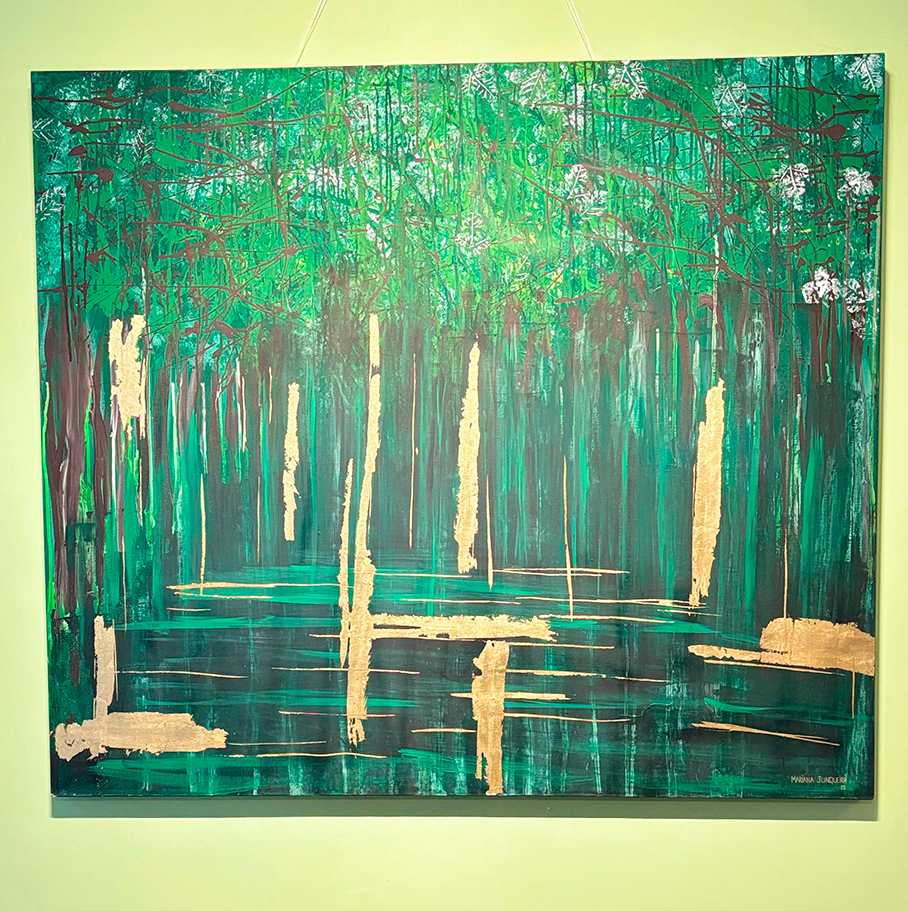 Acrílica e folhas de ouro sobre painel de algodão.